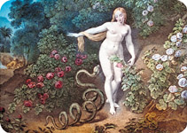 Dumnezeu a autorizat pe primii noștri părinți să mănânce în voie din toate roadele din Paradis, cu excepția celui numit „pomul cunoștinței binelui și răului”. Acesta le-a fost interzis o vreme ca probă a loialității. Ei au fost preveniți că mâncând din rodul lui își vor atrage blestemul - condamnarea la moarte. Șarpele a mâncat din diferitele roade și s-a arătat încântat mai ales de cel oprit. Observația a dovedit că fructul nu l-a omorât pe șarpe și mama Eva a dedus că Dumnezeu le interzisese să guste din cel mai bun fruct din Eden. Concluzia ei a fost că Dumnezeu avea un motiv egoist în interzicerea folosirii fructului, și anume, El se temea că făpturile Sale vor deveni înțelepte precum este El.